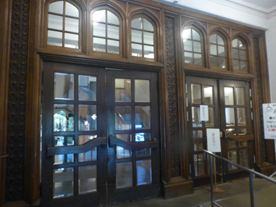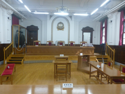 刑事法廷だった部屋は明治時代のレイアウトにしてあった。上段の向かって左端は検事席ということで、検事が裁判官並んでいたんだと知った。 |