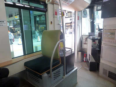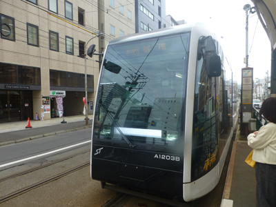中央区役所前電停から路面電車外回りに乗車。たまたまやってきた電車は最新型のだった。 |