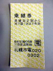下車するすすきの電停などいくつかの指定の電停では地下鉄乗継券が発行されるようだ。ICカードでも、申し出ると、乗り継ぎ運賃で地下鉄に乗れるようだが、乗継券がどんなのか気になったので、現金で支払い、乗継券をもらった。 |