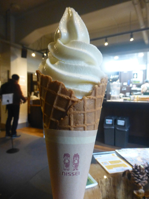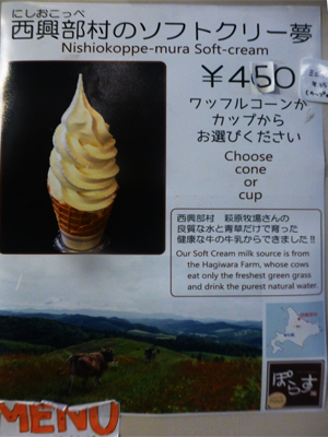 観光客向けのカフェと売店。下左 西興部村のソフトクリームを売っていたので食べてみよう。 下右 できあがったソフトクリーム。 |