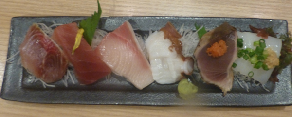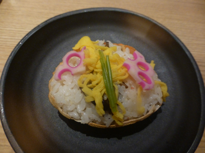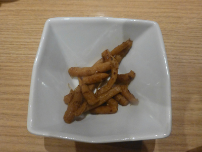 上 石狩鍋ができあがるまで、料理をいろいろいただく。握りすし盛り合わせ。 左 ごぼう。 |
