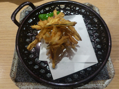 さつまいもとかぼちゃのかき揚げ。運ばれてくるまでに時間がたったのか、固かったのが残念。 |