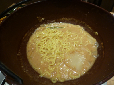 〆のラーメンを鍋に投入。石狩鍋でも最後に麺を入れるんだ。 |
