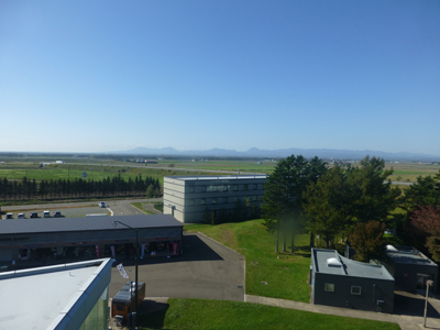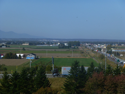札幌の方角を見る。平地ではあるが、左のほうに薄く山が見える。支笏湖近くの恵庭岳だろうか。長沼は、JR千歳線と室蘭本線の中間にあるので、鉄道では行けないので、ドライブでこれてよかった。 |