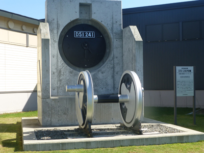 外に出ると、展示されているD51とは別のD51の釜の蓋と車輪だけが展示されている。もともと、このSLが展示されるはずだったのだが、追分機関区の火災で、このD51が燃えてしまい、急きょ別のSLが展示されたという。 |