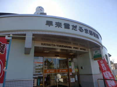早来雪だるま郵便局。屋根の上には雪だるま。郵便局以外にも雪だるまを屋根にとりつけた家があり、郵便局前の通りは、雪だるま通りだった。 |