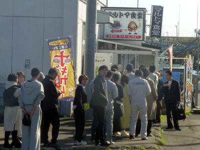 苫小牧に入り、ホッキ貝を食べようとマルトマ食堂をめざした。すでに13時なのだが、まだ長い行列であきらめた。 |