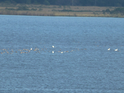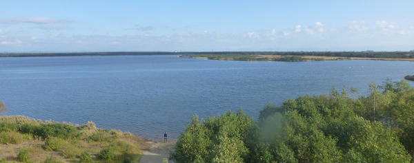 鳥がやってきている。渡り鳥だろうか。ウトナイ湖がラムサール条約で指定された湿地だとは知らなかった。札幌のような大都市に近いので意外だ。 下 湖のほぼ全体が見える。周囲は数kmで、湖というより沼という感じ。 |