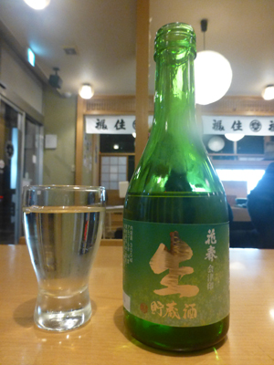 店内。下左 清酒「花春」。 下右 醸造所は福島県会津若松市の「花春酒造」。 せっかくだから北海道の地酒を飲みたかったので、残念。 |