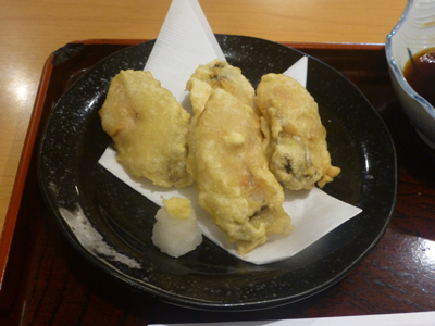 かき天ぷら。かき天をあてに、酒を飲み終わるころに、そばを注文。 |