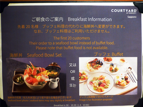 朝食のためレストランに行くと、前日までは気づかなかった案内を見た。ビュッフェにかえて海鮮丼にできるという。この日は海鮮丼にしよう。 |