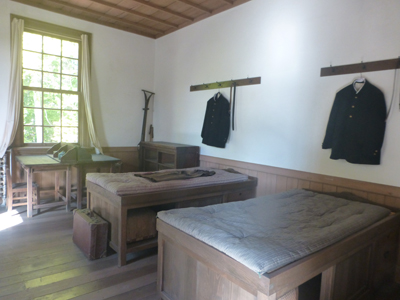 納内屯田兵屋の内部。農家の感じだが、軍服がかけらているのが特徴。 |