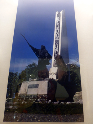 上 北海道博物館。左 アイヌの歴史、文化についての展示にもスペースが多くとられている。 写真はシャクシャインの像。シャクシャインは江戸時代の初期に松前藩でおこったアイヌの反乱のリーダー。反乱鎮圧後、松前藩のアイヌ支配は強まる。 |