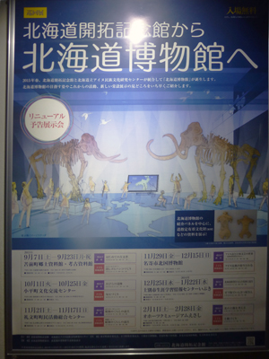 1時間ほど博物館に滞在。気が付くと新さっぽろ行きのバスの出発する16時2分の直前。大急ぎでバス停に向かい、飛び乗った。新さっぽろから地下鉄で宿に戻った。 |
