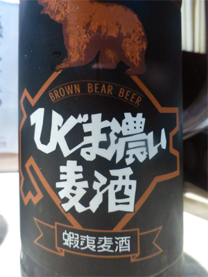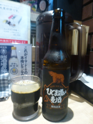 グループ客がでたあとなのかすいていたが、すぐに満席になった。下左 地ビール「ひぐま濃い麦酒」。黒ビールだ。 下右 醸造所は札幌市の「えぞ麦酒」。 |