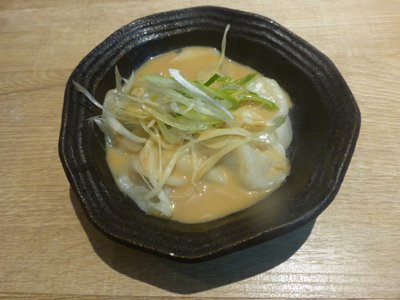 水餃子。ごまドレッシングがかけてある。ラーメン店で水餃子は珍しい。 |