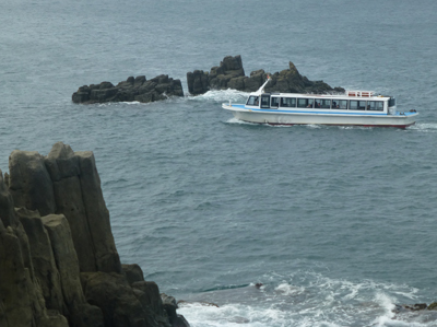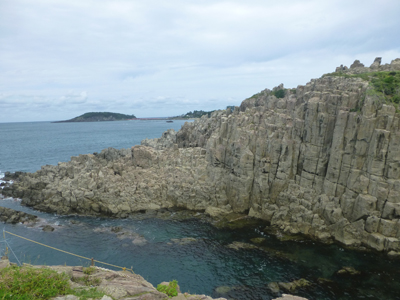 岩の上へ。直近でやってきたのは30年ほど前。久しぶりに見る。もっとも、サスペンスドラマのラストシーンなどで何度か見ている。船乗り場に下りる階段が見える。ロープも見えるが船をつなぐのだろう。岩場に上がって、風が強いことに気づいた。入江での接岸が難しいのだろう。 |