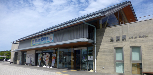 駅舎内。無人駅になっていて、窓口は閉鎖されている。下 海岸に出ると、三国港が見える。 |