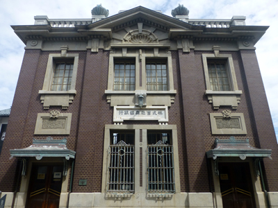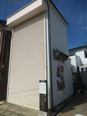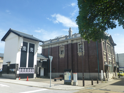 旧森田銀行の側面とその左の山車の保存庫。 |