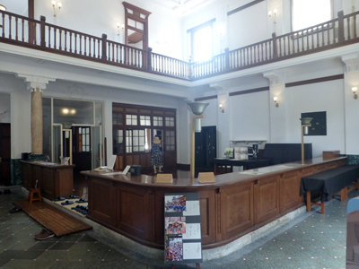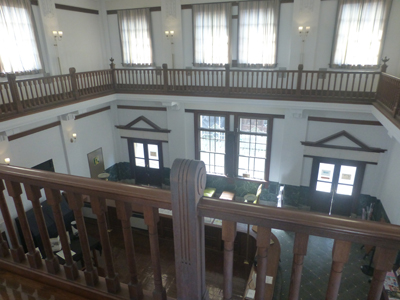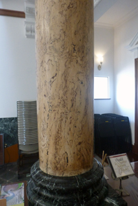 2階に上り、貴賓室を見る。貴賓室としては質素な感じ。下左 2階から1階を見下ろす。 下右 鉄の柱だが、大理石のような模様を描いていて、きれいだ。 |