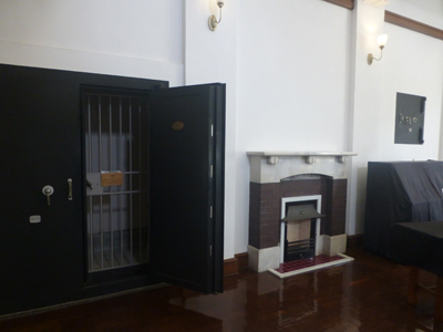 金庫。同様のものは何度か見ているが、ここの説明を読んで、右上の小さな扉は、閉じ込められた場合の脱出口の役割をもっていると知った。 |