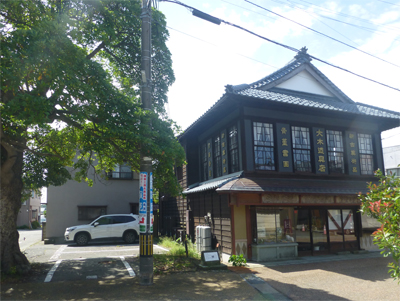 旧森田銀行と山車保管庫から見て、交差点をはさんで点対象の位置。古い商店があるが、その左の空地は内田本家跡。内田家も廻船業で財をなした。庭にあったタブノキが残っている。 |