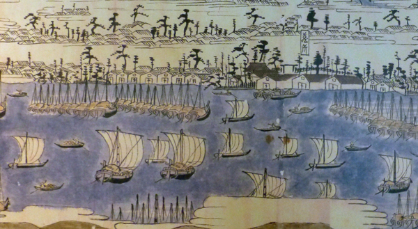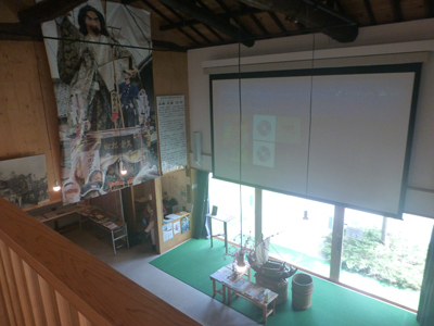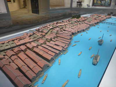 マチノクラ。三国湊の資料館。最初にビデオを見て、そのあと廻船業やゆかりの文学者についての展示を見る。 下 三国湊の往時の絵。廻船と蔵が描かれている。 |