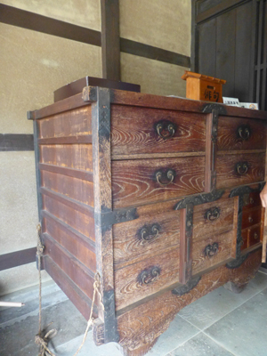 タンスに車輪がついている。火災や水害の時に、簡単に持ち出せるようにするため。三国湊は、九頭竜川の本流に支流が合流する近くにあり水害は起こりやすかったという。そのかわり、岩盤が固く、地震には強く、能登地震の際、近くの芦原は被害が多かったが、三国は被害が少なかったという。 |