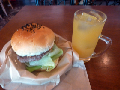 三国バーガーとオレンジジュースのセット。三国バーガーは見た目は普通のハンバーガーで、すぐにわかるのは、ピクルスかわりに、地元産のラッキョウを使っているくらい。でも説明を読むと、地元産の米を使ったパン、つなぎを使わない肉などの特徴があるという。 |
