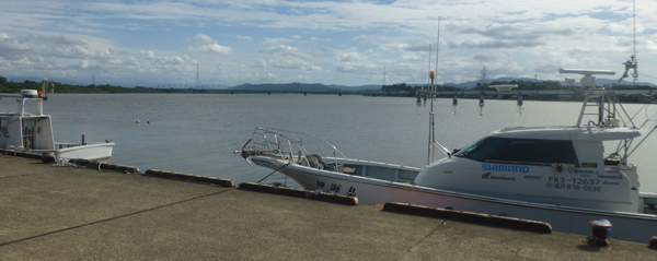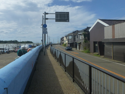 上 九頭竜川沿いに出た。九頭竜川は左から右に流れている。写真ではよくわからないが、支流が写真真中で合流している。左 かつては、右の陸側には蔵が並んでいたという。 |