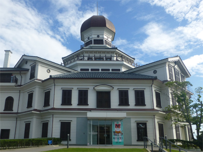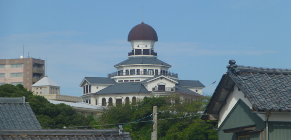 上 丘の上に見える龍翔博物館をめざす。上り坂が続き、なかなか大変だ。左 龍翔博物館に到着。明治時代につくられた龍翔小学校を模した建物。 |