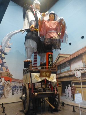 三国祭の山車。これは明治時代のものを模したもので、現在では高さ4mくらいだという。電線のために低くなったそうだ。 |