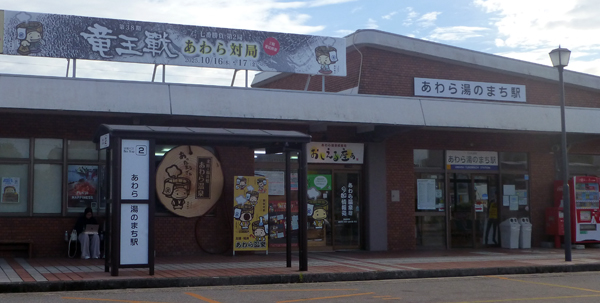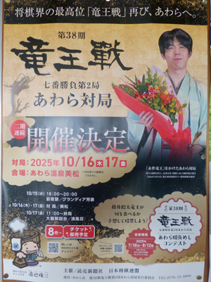 上 16時19分、あわら湯のまちに到着。駅舎の上に、竜王戦あわら対局の看板。左 竜王戦のポスターもあった。 |