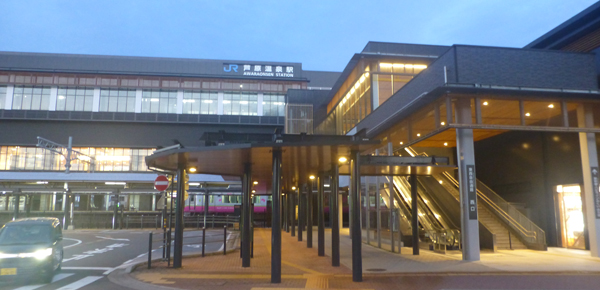 上 18時8分、芦原温泉駅着。芦原温泉駅はJR新幹線が主体の大駅に変わっていた。左 はぴラインの駅へは長い通路を歩かねばならず、不便だ。 |