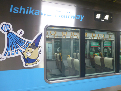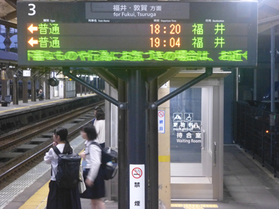 18時20分発福井行きは、IRいしかわの車両だった。福井・金沢間では、はぴラインふくいとIRいしかわは相互乗り入れしていて、県境での乗り換えはない。 |