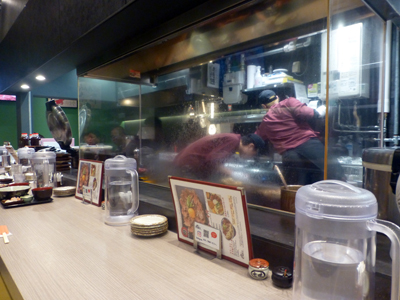 店内。注文は、席に着くと渡される紙のQRをスマートフォンで読み取ってメニューを表示させる方式。調理場はアクリル板で囲まれた中にある。 |