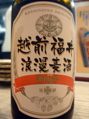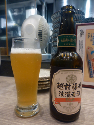 上左 飲物は地ビール「越前福井 浪漫麦酒」。上右 醸造元は福井市の「越の磯」。 左 「お肉3種盛り定食200g」。3種とは、ヒレ、サーロイン、サガリ。もやしなどの焼き野菜がついている。 |