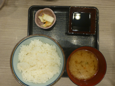 ご飯は中盛り。味噌汁、漬物。肉は味付けであるがソースもでてきた。満腹になって宿に戻った。 |