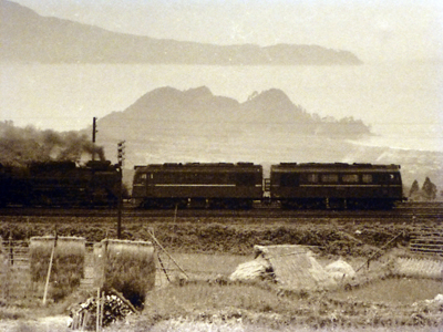 北陸トンネルができる以前の北陸本線杉津駅付近。海が見える。北陸トンネルのできる前は、海の見えるところを通っていたんだ。蒸気機関車の前にディーゼル機関車がついて牽引しているのも珍しい。 |