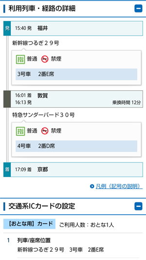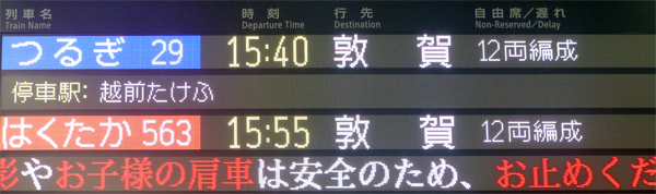 15時ごろレイトチェックアウトし、駅へ。土産物を少し買う。きっぷは、往路と同じく「関西北陸チケットレス」。改札の出入りはICカードで行うので、券売機できっぷを入手する必要はなく便利だ。 |