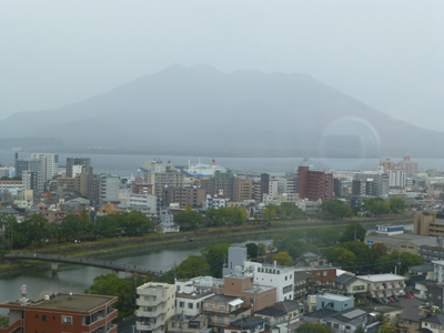 この日は雨。桜島もどうにか形がわかる程度。朝食をとって(写真は省略)、フロントで支払いを済ませておく。チェックアウトのさいには、キーボックスにカードキーを入れておけばよい。 |
