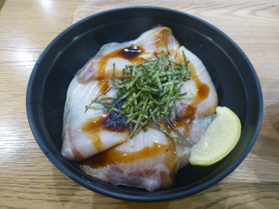 かんぱち丼。大きなかんぱちの切り身だ。鹿屋産のかんぱちという。ほかに、すまし汁がついていた。 |