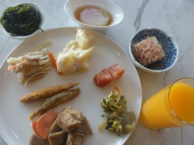 朝食。左上が「ひょっつる」。南有馬のもので、わかめをゼリーにして作った麺。 大皿の下が「からべ煮しめ」。外海のもので、煮たあと、水分を切った煮しめ。 |