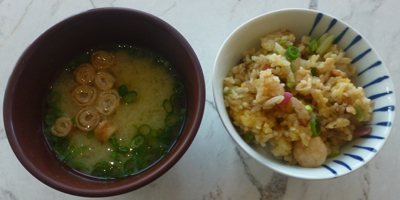 右は、ちゃんぽん飯。長崎の伝統料理ではないと思う。ちゃんぽんのスープと具を使った炊き込みご飯。 |