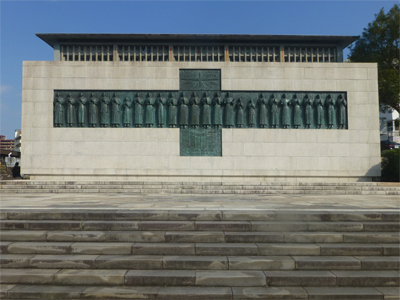 9時30分出発。NHK長崎放送局のすぐ上にある26聖人の殉教慰霊碑へ。26人の処刑は1597年、秀吉の命令で行われた。 |