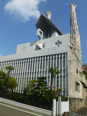 殉教地と道路を隔ててあるのが、日本26聖人記念聖堂 聖フィリッポ教会。通称、西坂教会。2本ある塔がガウディ設計の塔じゃないかって感じで印象的だ。入堂は坂を上り裏手に回ったところから。 ネット情報を調べてみて驚いた。この教会の設計者は今井健次で、この人は昭和初期にガウディを日本に紹介した人だということだ。 |