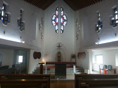 聖堂内。豪華ではないが、ステンドグラスを通る光で落ち着いた気持ちになる。 |
