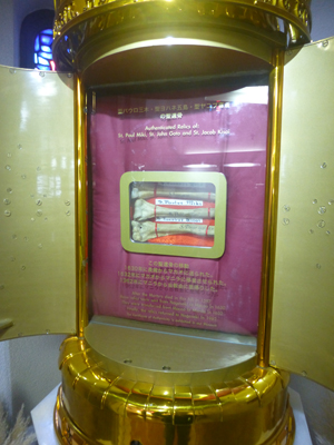 聖堂の中に、26聖人のうち聖パウロ三木、聖ヤコブ喜斎、聖ヨハネ五島の遺骨が納められていた。遺骨は、1630年に長崎からマカオへ、1632年にマカオからマニラへ、1962年にマニラから長崎へと運ばれた。 |