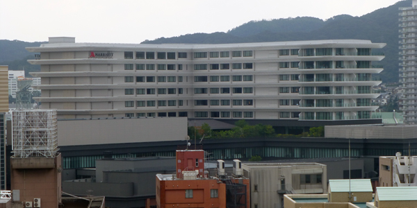 たった今、行ったばかりの聖フィリッポ教会の塔もよく見えた。下 大変なルートだったが、よかったのは、泊まっている長崎マリオットはよく見えたこと。近くからは全景はわからないが、丘の中腹からは目の高さで見える。 自室は、一番下(8階)の右端。 |