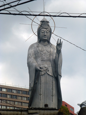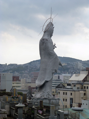 大観音は亀形の堂の上に立っていた。亀形の堂は閉まっていた。どこが本堂なのかわからなかった。かつてあった本堂は国宝だったとにことだが、原爆で焼けてしまった。 |